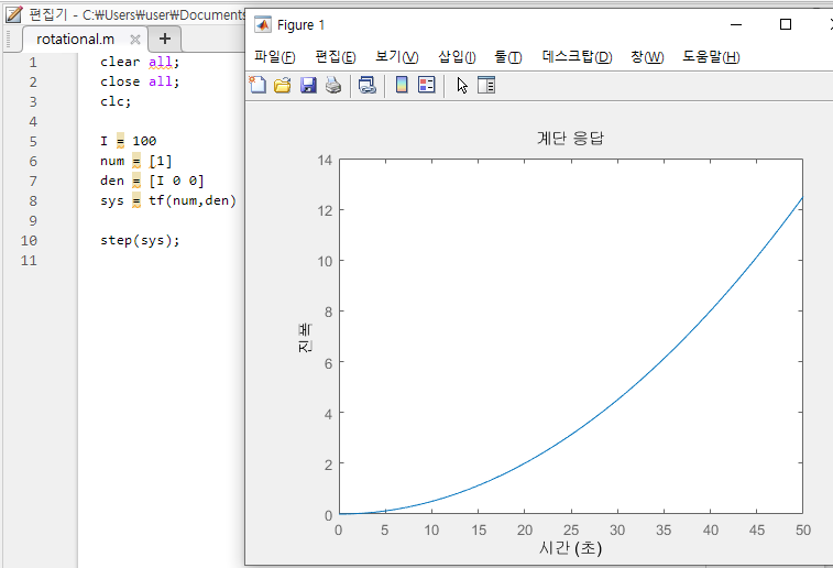이런식으로 나타나게 되고 이를 매트랩으로 step입력에 대해 시뮬레이션 해보면