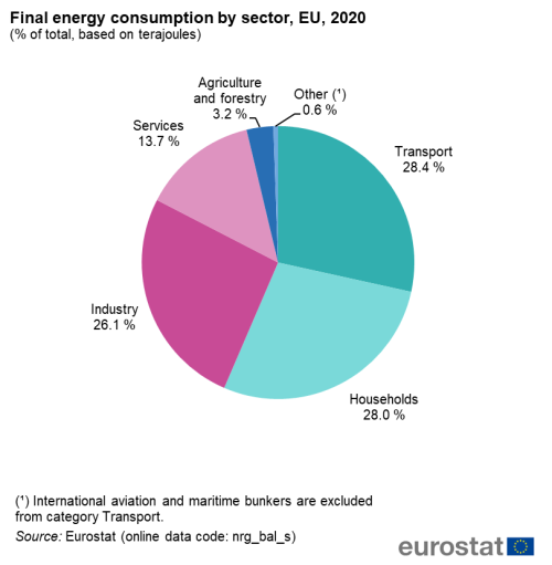 "최종에너지란 직접 에너지를 소비하는 최종단계의 에너지 소비량을 의미하며, 일차에너지 중 최종 부문의 소비자가 직접 소비한 에너지와 전환과정을 거쳐 생산된 이차에너지 산출량의 합으로 계산됨. 에너지 전환과정에서 손실로 총(일차)에너지 보다 항상 작음 최종에너지 소비는 산업, 수송, 건물(가정 및 상업) 부문으로 나뉘며, 에너지원별로는 석탄, 석유, 가스, 전력, 열 및 기타로 구성됨." (출처:오성범 평가사 블로그)